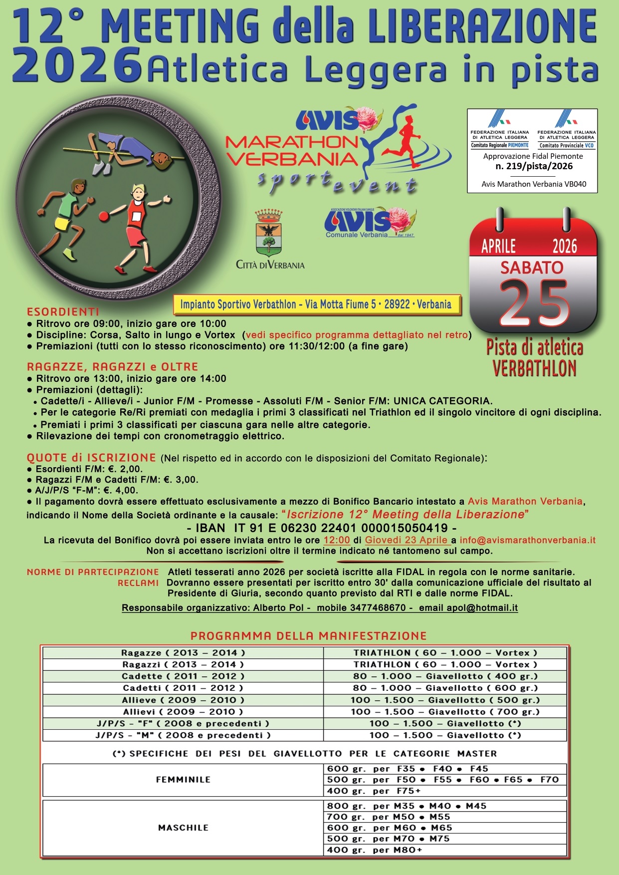 Sabato 25 aprile organizziamo il 12° Meeting della Liberazione in pista di atletica a Verbania, per il settore seniors sono previsti: 100 mt., 1.500 mt. e Giavellotto.