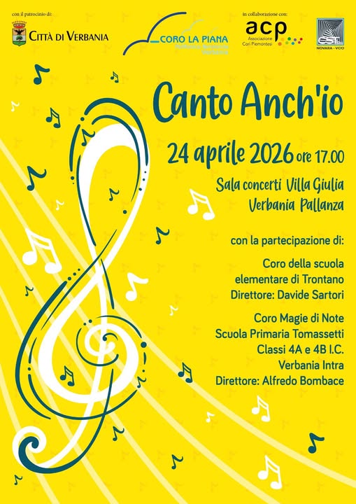 Briciole di pane Home Eventi CANTO ANCH'IO di: Comune di Verbania CANTO ANCH'IO Arte e Cultura Dolce Vita 24 Aprile Ore 17:00 / Durata 1 ora Villa Giulia - Sala concerti - ore 17.00Organizzazione a cura di Coro la Piana e ACP Donwload allegato