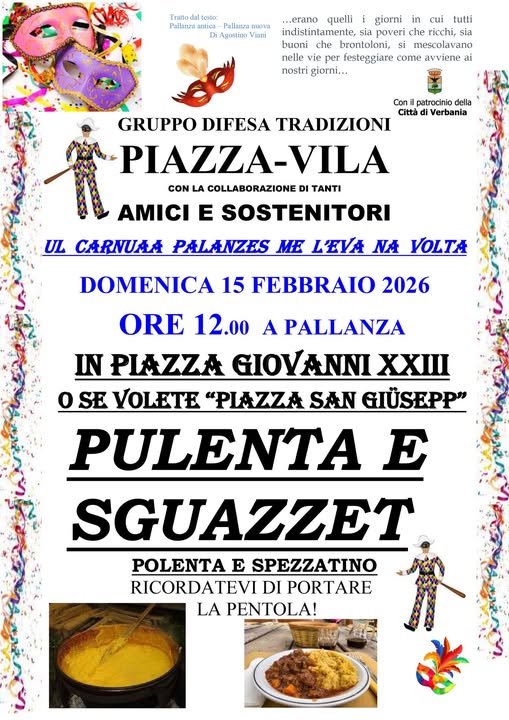 Il Gruppo Difesa Tradizioni Piazza - Vila, con la collaborazione di amici e sostenitori, organizza la distribuzione di "Pulenta e Sguazzet", polenta e spezzatino.