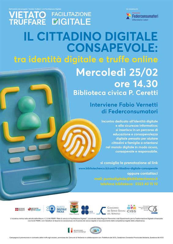 L’incontro promosso all'interno del progetto Rete di servizi di facilitazione digitale - Area del VCO, condotto da Fabio Vernetti di Federconsumatori, sarà dedicato all'Identità digitale e alla sicurezza informatica e si inserisce in un percorso di educazione e consapevolezza digitale pensato per aiutare cittadini e famiglie a orientarsi nel mondo digitale in modo sicuro, consapevole e responsabile.
