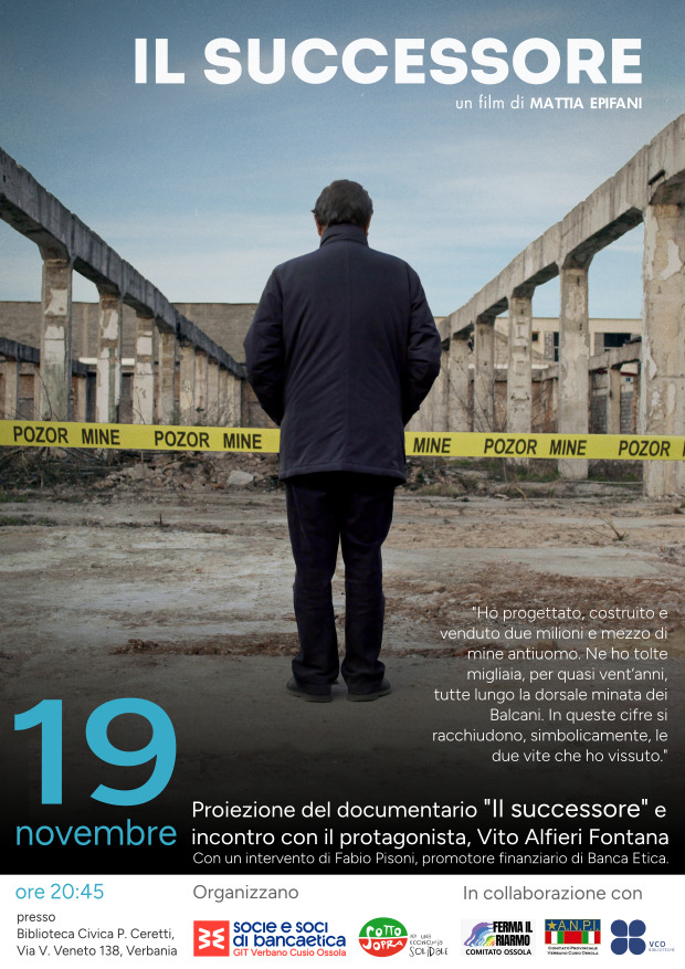 DA FABBRICANTE DI ARMI A SMINATORE: LE DUE VITE DI VITO ALFIERI FONTANAPer una quindicina d'anni Vito Alfieri Fontana ha progettato e prodotto mine antiuomo. Poi c'è la svolta, che lo porta per quasi 20 anni a operare come sminatore nei Balcani.Questa storia è al centro di una serata in cui, alla presenza del protagonista, verrà anche proiettato il film Il successore (di Mattia Epifani).