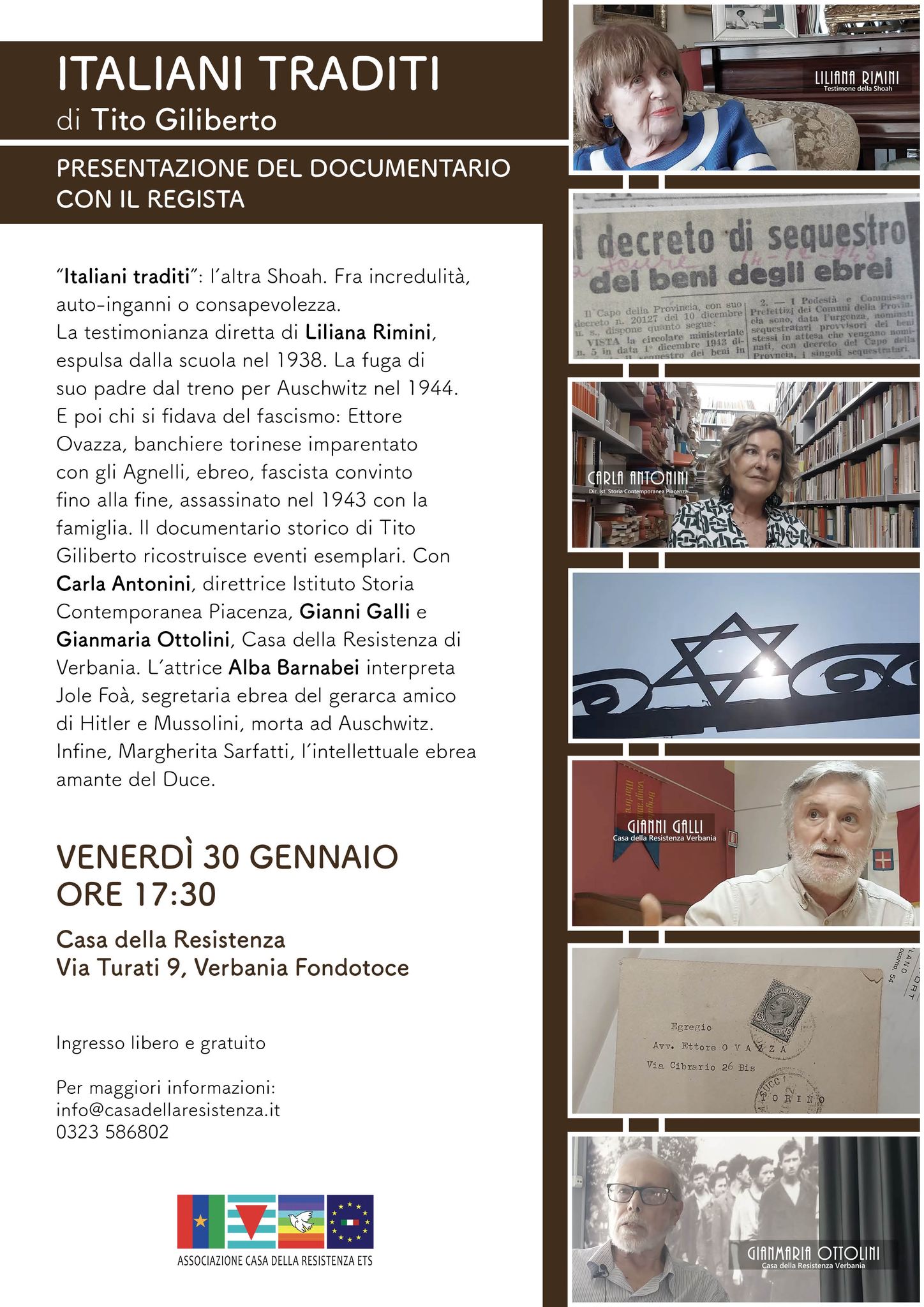 In occasione del Giorno della Memoria la Casa della Resistenza propone il documentario "Italiani traditi": l'altra Shoah di Tito Giliberto. Fra incredulità, auto-inganni o consapevolezza. La testimonianza diretta di Liliana Rimini, espulsa dalla scuola nel 1938. La fuga di suo padre dal treno per Auschwitz nel 1944. E poi chi si fidava del fascismo: Ettore Ovazza, banchiere torinese imparentato con gli Agnelli, ebreo, fascista convinto fino alla fine, assassinato nel 1943 con la famiglia. Il documentario storico di Tito Giliberto ricostruisce eventi esemplari. Con Carla Antonini, direttrice Istituto Storia Contemporanea Piacenza, Gianni Galli e Gianmaria Ottolini, Casa della Resistenza di Verbania. L'attrice Alba Barnabei interpreta Jole Foà, segretaria ebrea del gerarca amico di Hitler e Mussolini, morta ad Auschwitz. Infine, Margherita Sarfatti, l'intellettuale ebrea amante del Duce.