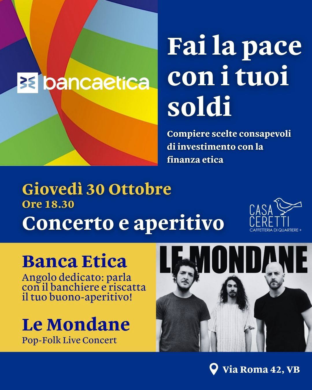 Ti aspetta un aperitivo in musica con i banchieri e i promotori di Bancaetica pronti a raccontarti un modo diverso di pensare la finanza: più vicino alle persone e al pianeta.