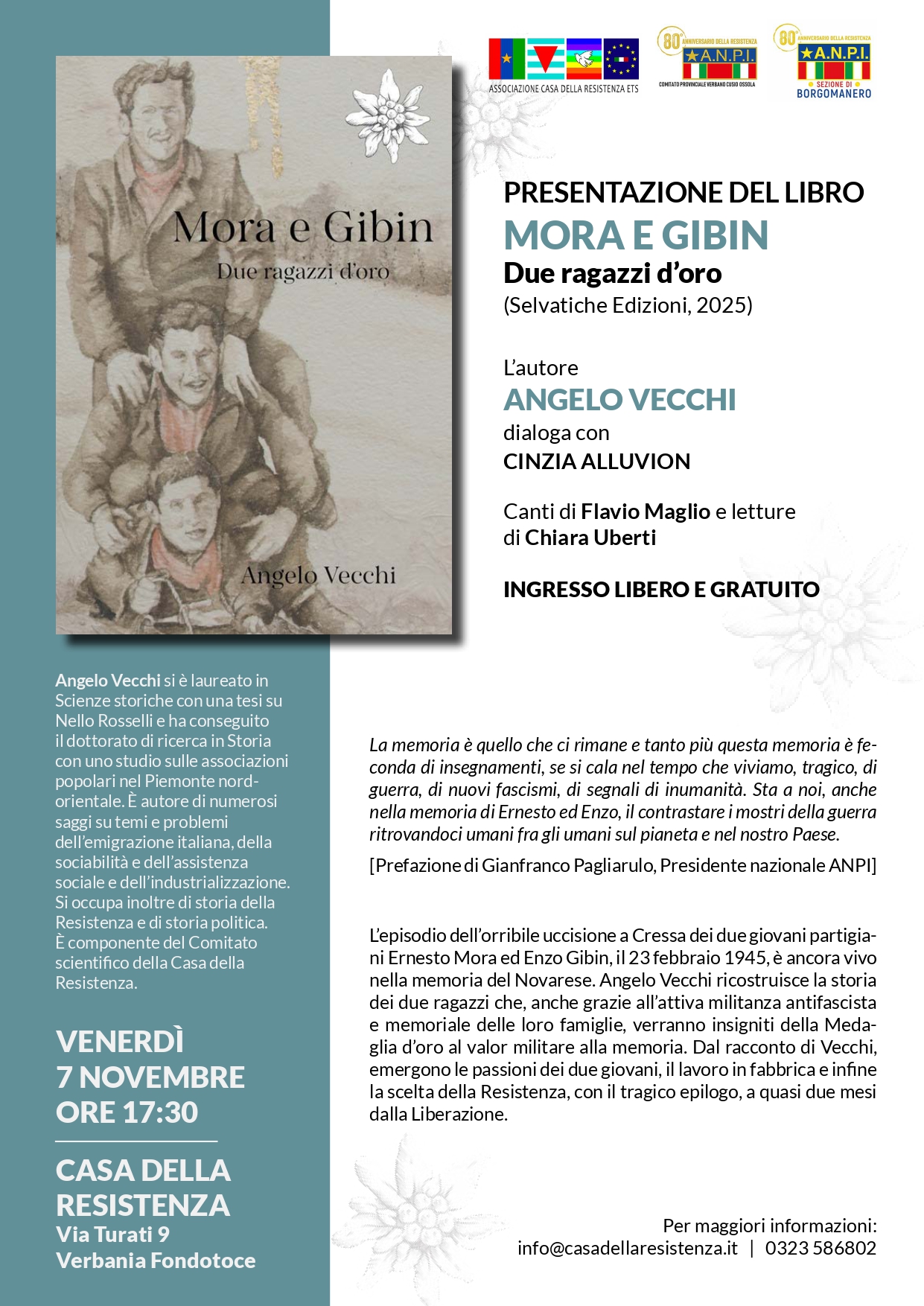 Presentazione del volume Mora e Gibin. Due ragazzi d'oro (Selvatiche Edizioni, 2025) di Angelo Vecchi. Il libro narra l’episodio dell’orribile uccisione a Cressa dei due giovani partigiani Ernesto Mora ed Enzo Gibin, il 23 febbraio 1945, ancora vivo nella memoria del Novarese. Angelo Vecchi ricostruisce la storia dei due ragazzi che, anche grazie all’attiva militanza antifascista e memoriale delle loro famiglie, verranno insigniti della Medaglia d’oro al valor militare alla memoria. Dal racconto di Vecchi, emergono le passioni dei due giovani, il lavoro in fabbrica e infine la scelta della Resistenza, con il tragico epilogo, a quasi due mesi dalla Liberazione. Durante la presentazione l'autore Angelo Vecchi dialogherà con Cinzia Alluvion. Seguiranno canti di Flavio Maglio e letture di Chiara Uberti.