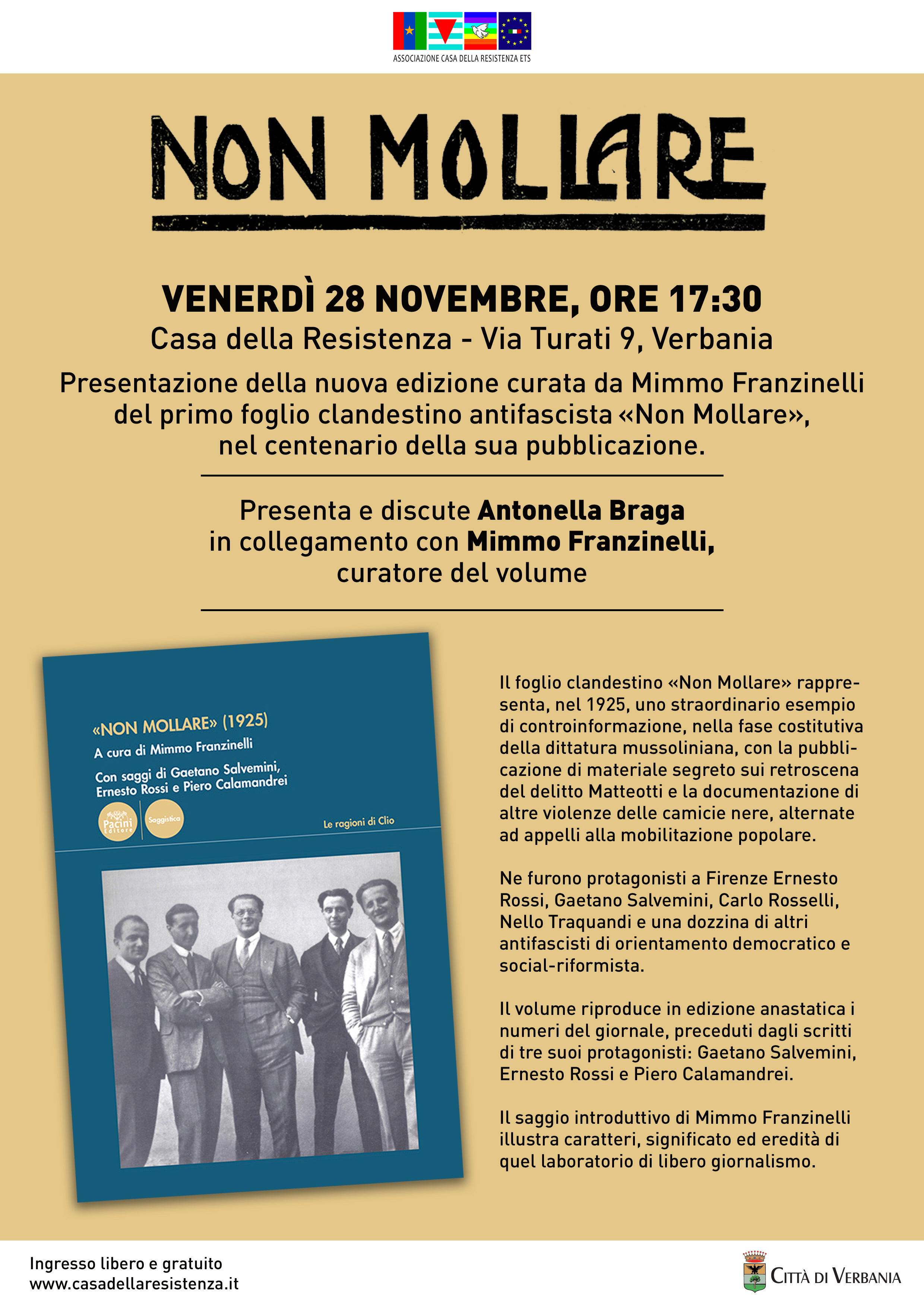 Presentazione della nuova edizione curata di Mimmo Franzinelli del primo foglio clandestino antifascista «Non Mollare» (1925) nel centenario della sua nascita e ripubblicato nel 2025 da Pacini Editore. Presenta e discute Antonella Braga in collegamento con Mimmo Franzinelli, curatore del volume.