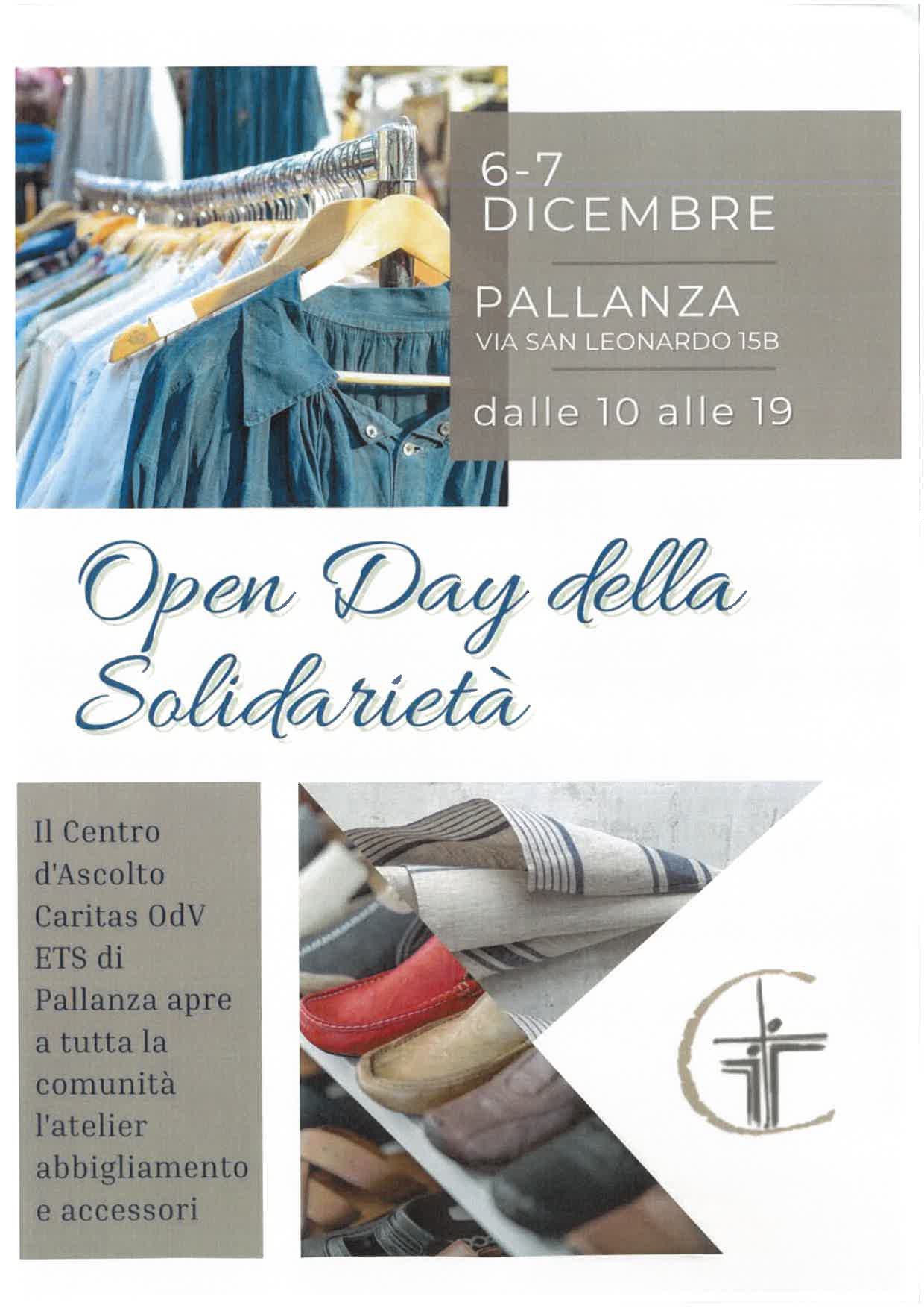 Briciole di pane Home Eventi Open Day della Solidarietà di: Comune di Verbania Open Day della Solidarietà Dal 6 Dicembre al 7 Dicembre Ore 10:00 / Durata 9 ore Sabato 6 e domenica 7 dicembre 2025ore 10/19Centro di Ascolto Caritas OdV ETS - Verbania PallanzaIl Centro d'Ascolto Caritas OdV ETS di Verbania Pallanza apre a tutta la comunità l'atelier abbigliamento e accessori Donwload allegato