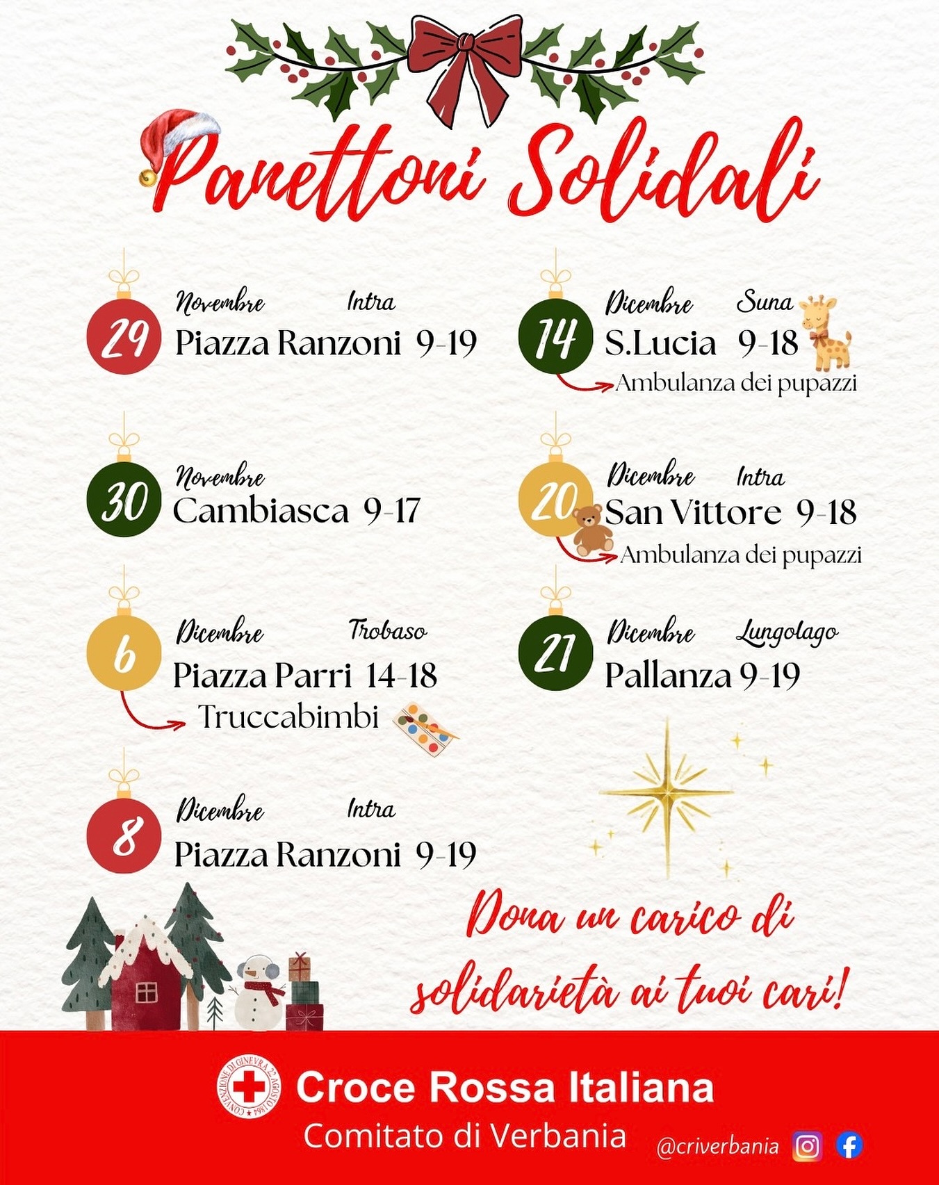 Oltre alla presenza nelle piazze verbanesi, potete ordinare i panettoni:Al seguente link: https://form.jotform.com/253033418144449 Per poi ritirarli presso la nostra sede operativa (via Fiume 21 Verbania, di fronte all’ospedale). Sarà possibile scegliere la data di ritiro durante la compilazione dell’ordine.I panettoni disponibili sono:Classico (1kg)Cioccolato (750gr)Pandorella(1kg) [quantità limitata!]Prezzo: 15 EUR l’unoModalità di pagamento accettata: bonifico bancario entro massimo due giorni prima del ritiro, PayPal o contanti/POS al ritiro.