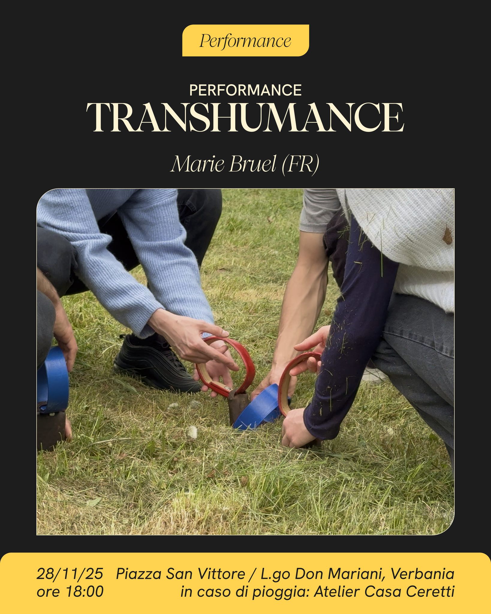 La performance porta in città una danza che reinterpreta il movimento stagionale che greggi e mandrie compiono insieme ai pastori nei territori rurali e attraverso i centri abitati.Il lavoro è frutto di una ricerca che Marie inizia incontrando le comunità dei Pirenei e che qui ha svolto attraverso un laboratorio di movimento creativo con lз ragazzз all’ Istituto Cobianchi, e intervistando pastore e pastori del Verbano e Alto Vergante che intrecciano le memorie delle transumanze antiche alle nuove strategie di convivenza con l'ecologia del presente.Marie Brual (FR) è danzatrice, coreografa e pedagoga impegnata in progetti di ricerca performativa tra Francia e Marocco. È vincitrice del bando Noveau Grand Tour per artistз under 35 supportato dall’Istituto Francese e dall’Ambasciata di Francia in Italia. Marie è stata accompagnata dalla danzatrice e coreografa Elisa Sbaragli in qualità di tutor.