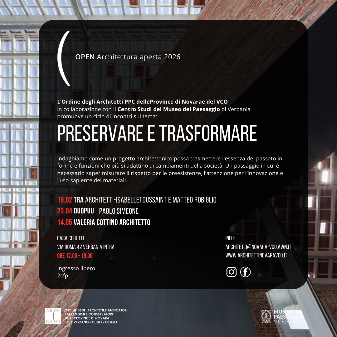 “Preservare e trasformare: riflessioni sull’Architettura e il Paesaggio”, promosso dalla commissione cultura dall’Ordine degli Architetti PPC delle province di Novara e Verbano-Cusio-Ossola."Preservare e trasformare" - Un percorso aperto al pubblico per riflettere su recupero, innovazione e trasformazione dei luoghi, all’interno della rassegna “Open – Architettura aperta 2026”.