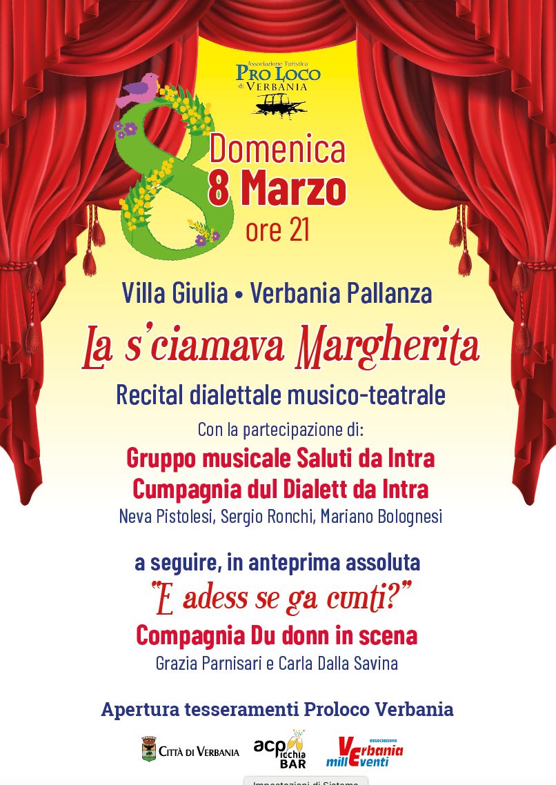Briciole di pane Home Eventi Recital dialettale musico-teatrale "La s'ciamava Margherita" di: Comune di Verbania Recital dialettale musico-teatrale "La s'ciamava Margherita" Arte e Cultura Dolce Vita 8 Marzo Ore 21:00 / Durata 2 ore 30 minuti 8 marzo 2026 - ore 21.00Villa Giulia PallanzaSpettacoli teatrali e apertura tesseramenti Pro Loco di Verbania Donwload allegato