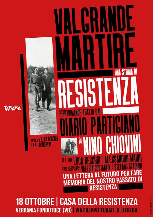 Sabato 18 ottobre, ore 18.00, alla Casa della Resistenza di Verbania Fondotoce, il Parco Letterario Nino Chiovini ha il piacere di ospitare lo spettacolo teatrale "Valgrande Martire. Una storia di Resistenza".L'ideazione è di Luca Recchia (A.k.a. Lupmorthy)- narrazione sonora e Alessandro Mauri - testo ed è tratta dal diario partigiano di Nino Chiovini. Con la partecipazione delle voci recitanti di Valeria Costantin e Stefano Spairani.Lo spettacolo-performance vuole essere una lettera al futuro per fare memoria del nostro passato di Resistenza."Attraverso le parole e la riproduzione di suoni registrati nei luoghi della Resistenza, cerchiamo di costruire un ponte che renda la memoria di quegli eventi vivida e concreta anche per chi può solo sentirli raccontare."L'ingresso è gratuito.