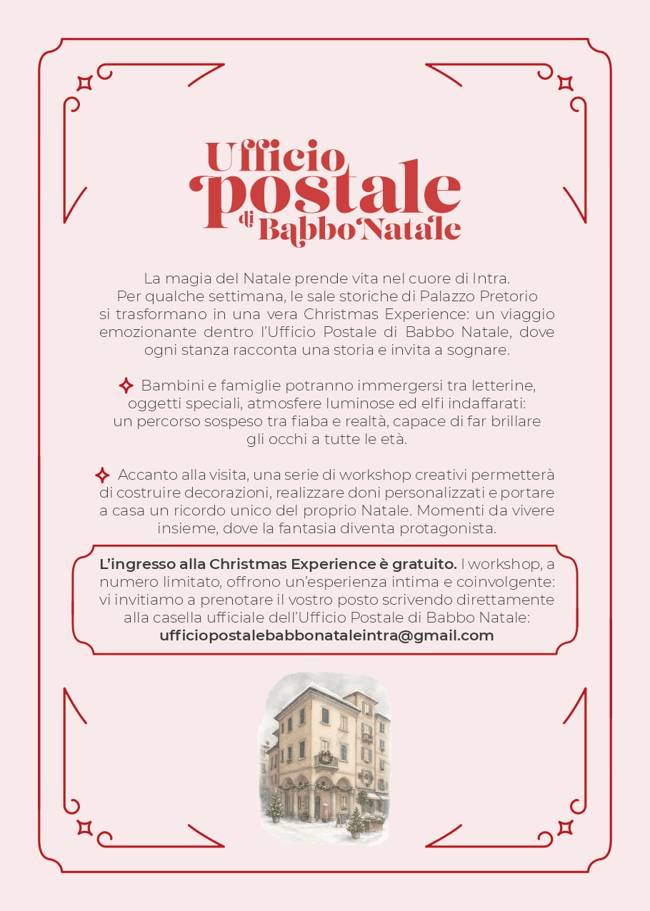Per qualche settimana, le sale storiche di Palazzo Pretorio si trasformano in una vera Christmas Experience: un viaggio emozionante dentro l’Ufficio Postale di Babbo Natale, dove ogni stanza racconta una storia e invita a sognare.