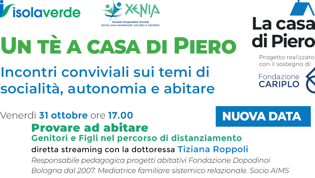 Ricominciano gli appuntamenti con Un tè a casa di Piero.Primo incontro in streaming venerdì 24 ottobre con Tiziana Roppoli, mediatrice familiare sistemica, associata AIMS (Associazione internazionale mediatori sistemici) e allieva didatta presso l'stituto di Terapia familiare di Bologna; insegnante ed educatrice professionale specializzata nella riabilitazione dei disabili mentali, ha svolto per 20 anni attività di progettazione servizi per disabili e famiglie con particolare attenzione al lavoro di cura delle madri collaborando con Anffas, l'Asphi ed Università degli studi di Bologna. Si occupa di mediazione dal 2002 e dal 2007 è responsabile pedagogica dei progetti abitativi Fondazione Dopo di Noi Bologna onlusVenerdì alle 17 ci parlerà di "percorso di distanziamento" fra genitori e figli, di quel passaggio importante che è prendere la distanza quando un proprio caro con disabilità vuole abitare in autonomia.L'incontro è come sempre aperto a tutti e gratuito. Suggeriamo di prenotare il proprio posto email info@lacasadipiero.org tel. 0323 551 465cell 335 5756972