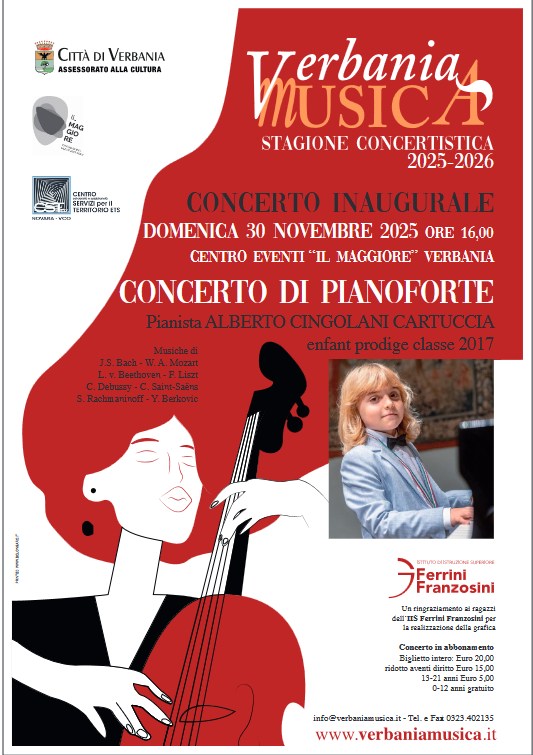 Briciole di pane Home Eventi VERBANIA MUSICA STAGIONE 2025 2026 di: Comune di Verbania VERBANIA MUSICA STAGIONE 2025 2026 Arte e Cultura Dolce Vita 30 Novembre Ore 16:00 / Durata 2 ore Domenica 30 novembre 2025 - ore 16.00Teatro Il Maggiore - FoyerAlberto Cingolani Cartuccia pianoforteSede Associazione Verbania Musica : Corso Mameli 49tel. e fax 0323 402135www.verbaniamusica.itinfo@verbaniamusica.it Donwload allegato Verbania Musica retro
